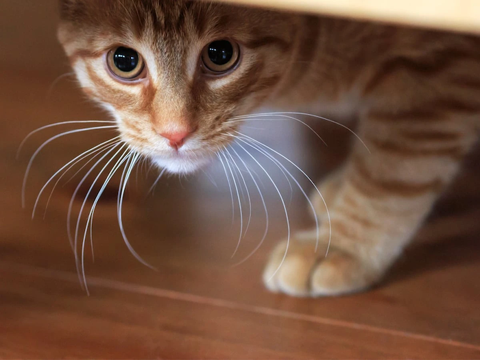 The cat in the image appears to be alert and cautious. Its wide, focused eyes and slightly forward-leaning posture suggest it is paying close attention to something. The whiskers are spread forward, which can indicate curiosity or a heightened state of awareness. This body language is typical of a cat that is either investigating something unfamiliar or feeling slightly on edge.