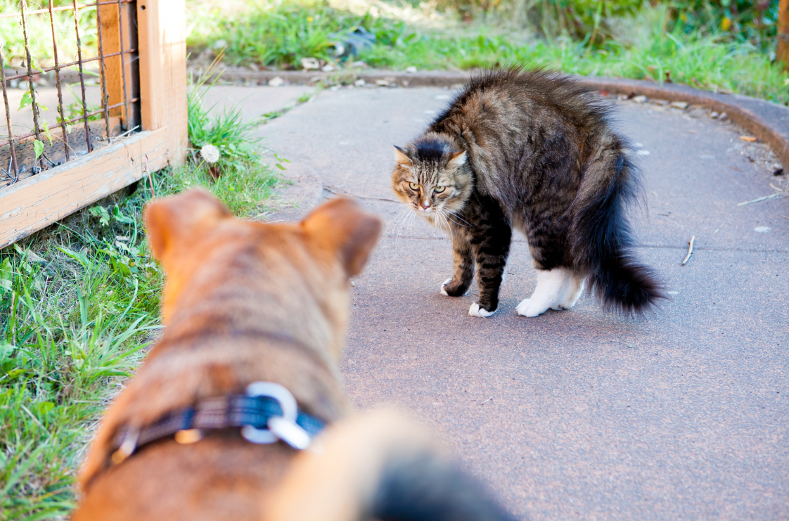 Stiff posture and direct eye contact: The cat is focused on the approaching dog and is preparing to either defend itself or flee if necessary.