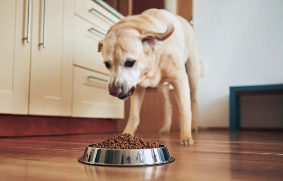 The raised ears and forward stance also suggest curiosity and readiness, indicating the dog is likely about to start eating.
