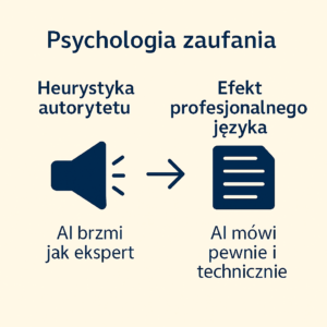 Dlaczego tak łatwo ufamy technologiom? Psychologia podpowiada, że jednym z głównych mechanizmów jest heurystyka autorytetu – skłonność do uznawania informacji za prawdziwe, jeśli są podawane przez źródło postrzegane jako kompetentne, a cytując Lucyna Bakiera: „Heurystyka autorytetu polega na tym, że ludzie mają tendencję do uznawania informacji za prawdziwe, jeśli są podawane przez źródło postrzegane jako kompetentne lub posiadające władzę, nawet jeśli brak jest obiektywnych dowodów”. W przypadku AI rolę „autorytetu” pełni sam algorytm, który formułuje odpowiedzi w sposób spójny, logiczny i pozbawiony wahań. Jak zauważa literatura psychologiczna, ludzie często traktują takie komunikaty jako bardziej wiarygodne niż treści, które brzmią niepewnie.
