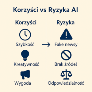 Jednym z największych zagrożeń związanych z korzystaniem z narzędzi sztucznej inteligencji jest możliwość generowania treści nieprawdziwych lub wprowadzających w błąd. Algorytmy nie posiadają własnej wiedzy – bazują na danych, które mogą być nieaktualne, niepełne albo obciążone błędami. W efekcie użytkownik otrzymuje tekst, który brzmi wiarygodnie, ale w rzeczywistości powiela fałszywe informacje. To szczególnie niebezpieczne w kontekście edukacji i pracy akademickiej, gdzie brak krytycznej weryfikacji może prowadzić do powielania mitów czy błędnych wniosków.